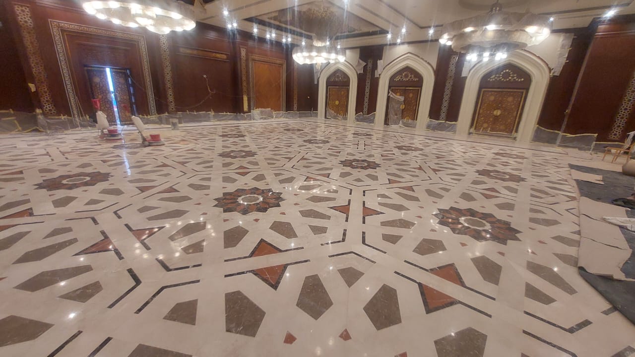 The marble used here tells a story of precision and pride. With subtle veins flowing like quiet prayers across the stone, and cool tones echoing calm and strength, every detail was designed to create a peaceful, dignified atmosphere. From the vast prayer halls to the intricate details in corridors and ablution areas, the marble brings unity and grace to the structure.